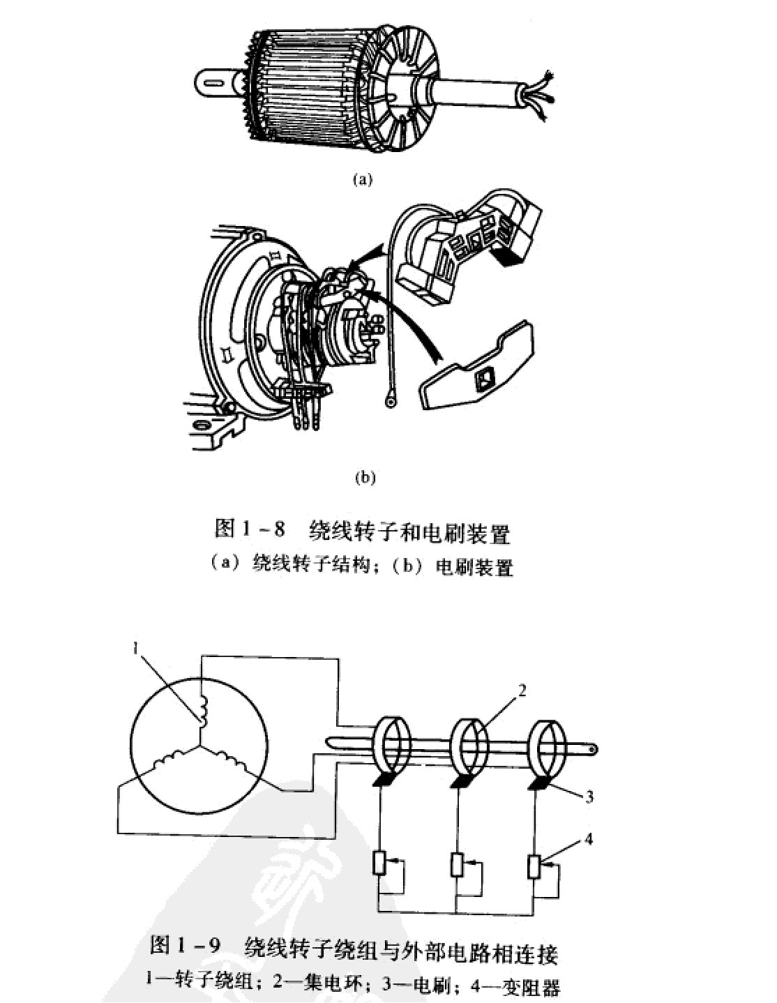 绕线转子是用绝缘导线做成线圈,嵌人转子槽中,再连接成三相绕组,一般都接成星形(丫)。图I一8所示为绕线转子和电刷装置。转子的一端装有3个滑环,称集电环。三相绕组的首端引出线分别与3个滑环相接。梅个滑环上各有一个电刷,通过电刷将转子绕组与外部电路相连接,如图1 -9所示,以改善起动性能或调节电动机的转速。