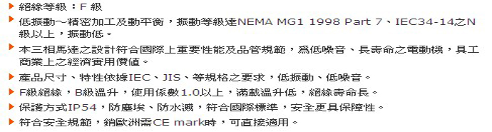 高崎卧式高效率电机轴端攻牙高崎高效率电机高崎电机一直不断投注与研究开发高效能产品,使用最先进的电脑辅助设计仪器及噪音测试室等设备,借以提升各项产品设计和监测能力等```使得产品具有体积小.重量轻.低噪音.高效率.寿命长等优点,深获得各界肯定;并用管理现代化.设备自动化来提高生产效率,降低成本,强化国际市场竞争力铝合金外壳系列马达马力:0.25HP-20HP电压范围:50HZ:220V。380V/415V 60HZ:220V。380V/415V 绝缘等级:F CLASS IP55高效率EFF1接线盒可多边安装,90度旋转,CE UL ISO9001认证。