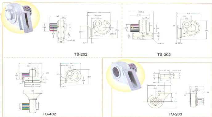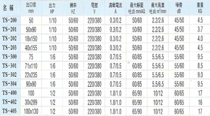 TS201-405鼓风机特性说明: 一般用于塑胶材料片材的挤出、吹塑等相关机械设备上的抽排风,采用铝合金重力压铸外壳,配合离心叶轮及优化参数设计,使各风压及风流量达到所配置的性能最优,以利使用寿命能完全配合所设计的8---10年! TS系列说明:名称 出口径 出力 频率 电压 满载电流 最大静压 最大风量 噪音 重量