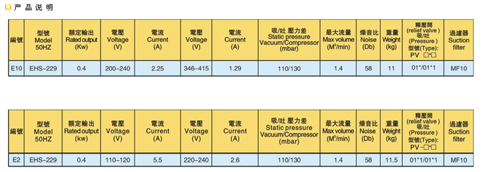 EHS229特点:安装容易,风量大,压力高,低噪音,作动原理,无油无污染,寿命长。它主要用于:切纸机,燃烧降氧机,卷烟滤嘴成型机,电镀槽液搅拌,雾化乾燥机,水处理爆气,水产,丝网印刷机,照相制版机,注塑机自动上料烘干机,液体灌装机,粉末灌装机,电焊设备,电影机械,纸张运送,清洁用途,空气除尖,干瓶,气体传送,送料,收集等方面功率:0.18KW 0.4KW 0.75KW 1.1KW 1.75KW 2.2KW 3.7KW 4KW 5.5KW 7.5KW 9KW 13KW 20KW 风压:50mbar~650mbar 风量:40立方/小时~1134立方/小时(为方便选用不同规格,单段式/双段式均有货提供)频率:50Hz/60Hz 电压:110V~615V(万国电压,各国均可使用。如需特殊电压,可按要求定做)释压阀 RV-01 RV-02(配套使用)过滤器 MF8 MF10 MF12 MF16 MF-20 MF-32 本公司有专业的相关技术工程师,欢迎广大客户来电来函咨询相关业务--风机,高压风机,鼓风机,升鸿高压风机,升鸿高压鼓风机,瑞昶风机,旋涡气泵,旋涡风机,吸风泵,吸料风机,真空泵,侧流风机,涡流泵。1、型号齐全-低震动-体积小-重量轻-低噪音-新设计-风量大-压力高-寿命长-保养容易-